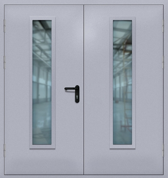 Распашная серая пожаростойкая дверь DO012 со стеклянными вставками в обоих полотнах в базовой сборке имеет цилиндровый замок, нажимную ручку, два полиуретановых уплотнителя.